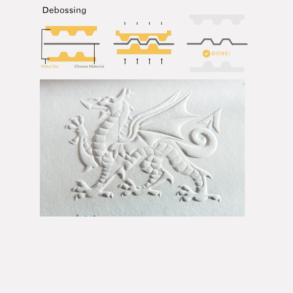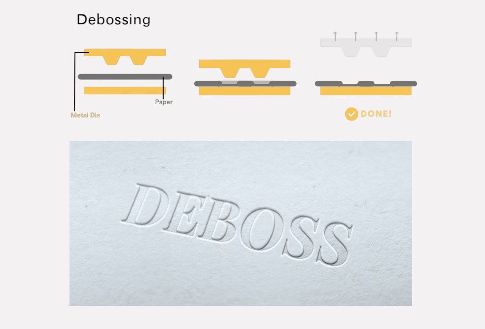 Debossing employs a concave template (negative template) under pressure to imprint the surface of the printed material, creating a depressed, three-dimensional pattern. Similar to embossing, debossing adds a tactile and visual impact, and the paper requirements are the same. Both embossing and debossing can be combined with processes like hot stamping, spot UV, and more.